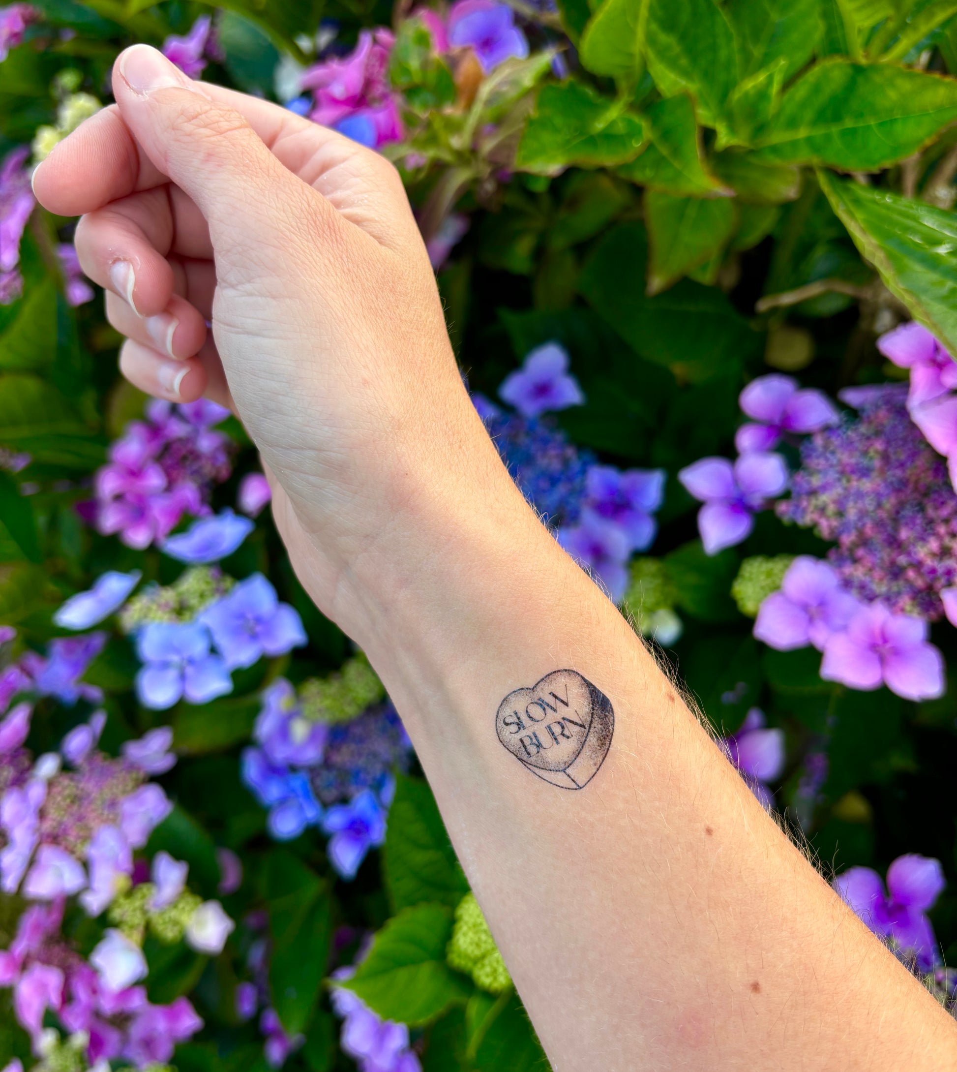 CAREFULLY PEEL BACK THE BACK SIDE OF THE TATTOO. LASTS 1-3 DAYS.