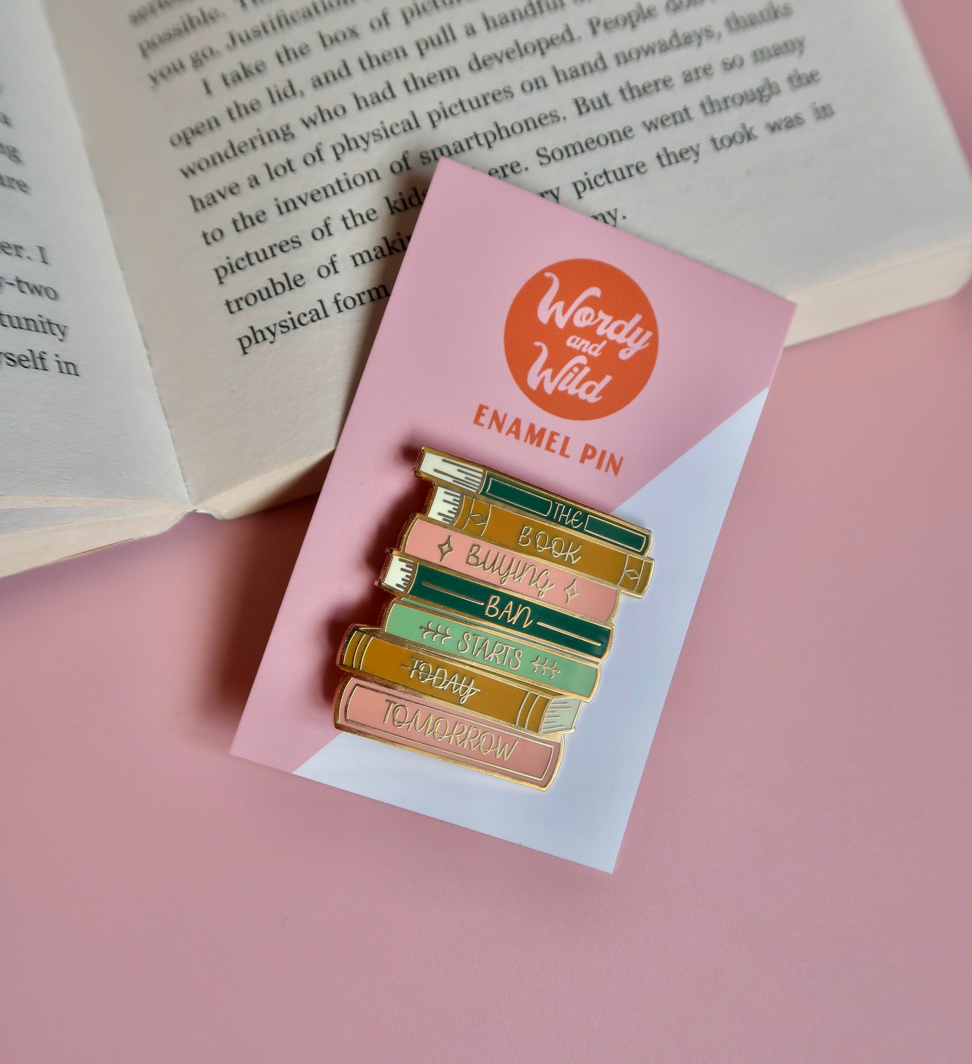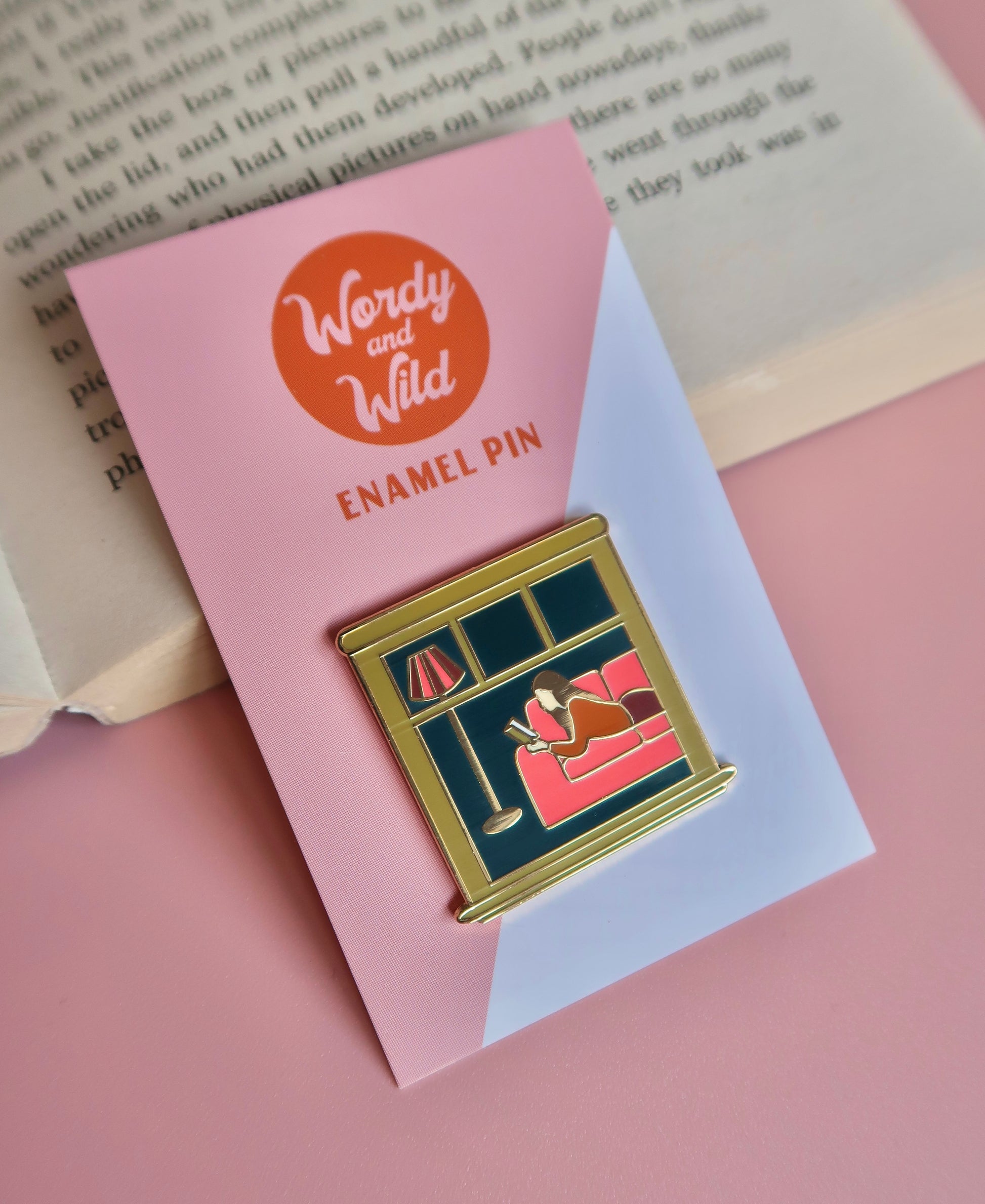 3. Tired But Still Reading - Blue pin with woman’s head in a orange book