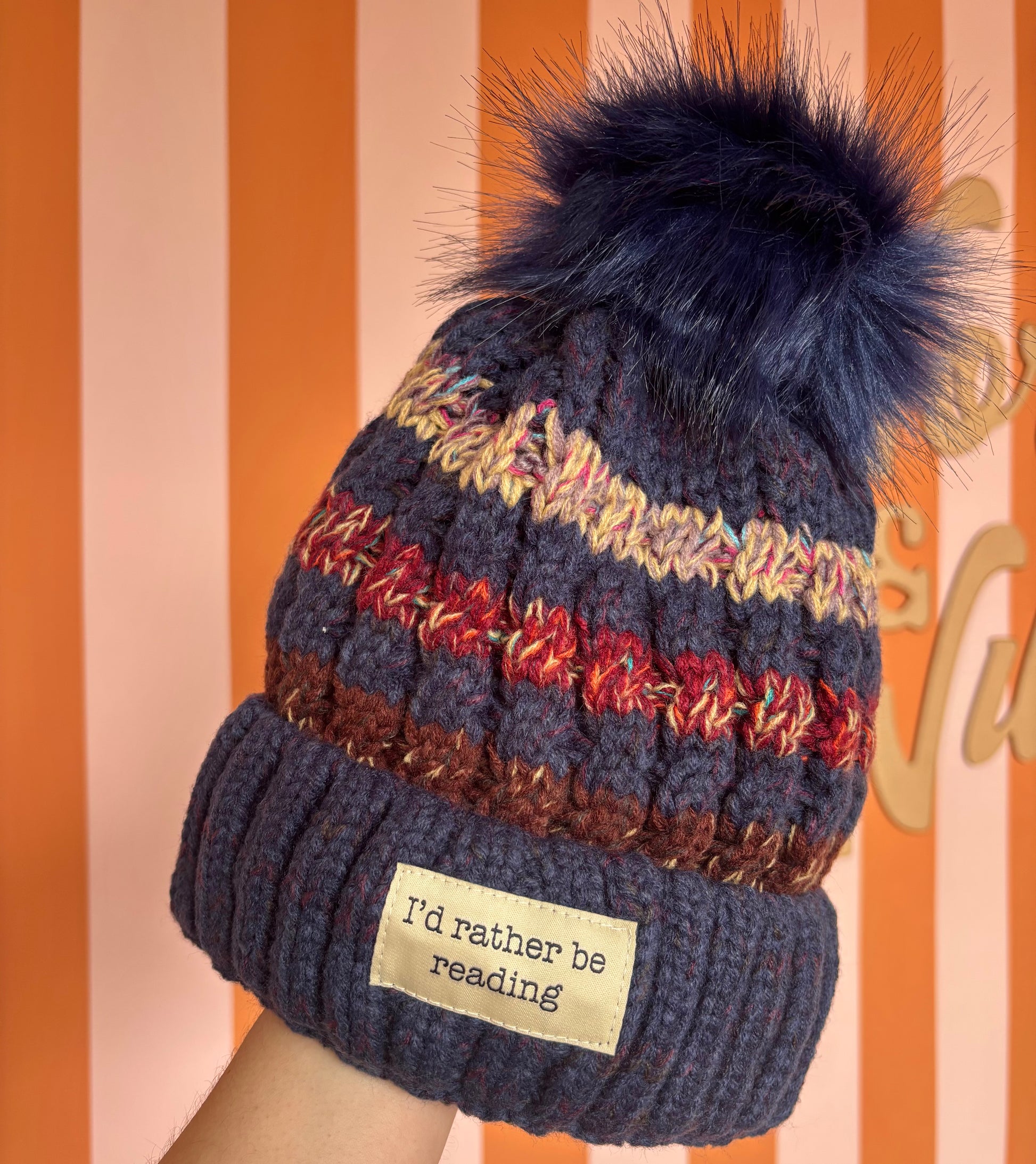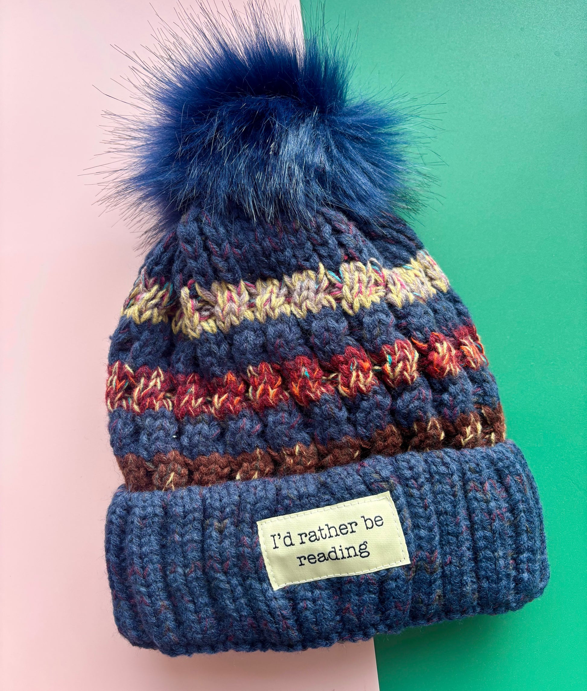 This navy bobble hat features the phrase "I'd rather be reading" on the front, offering a subtle nod to book lovers.