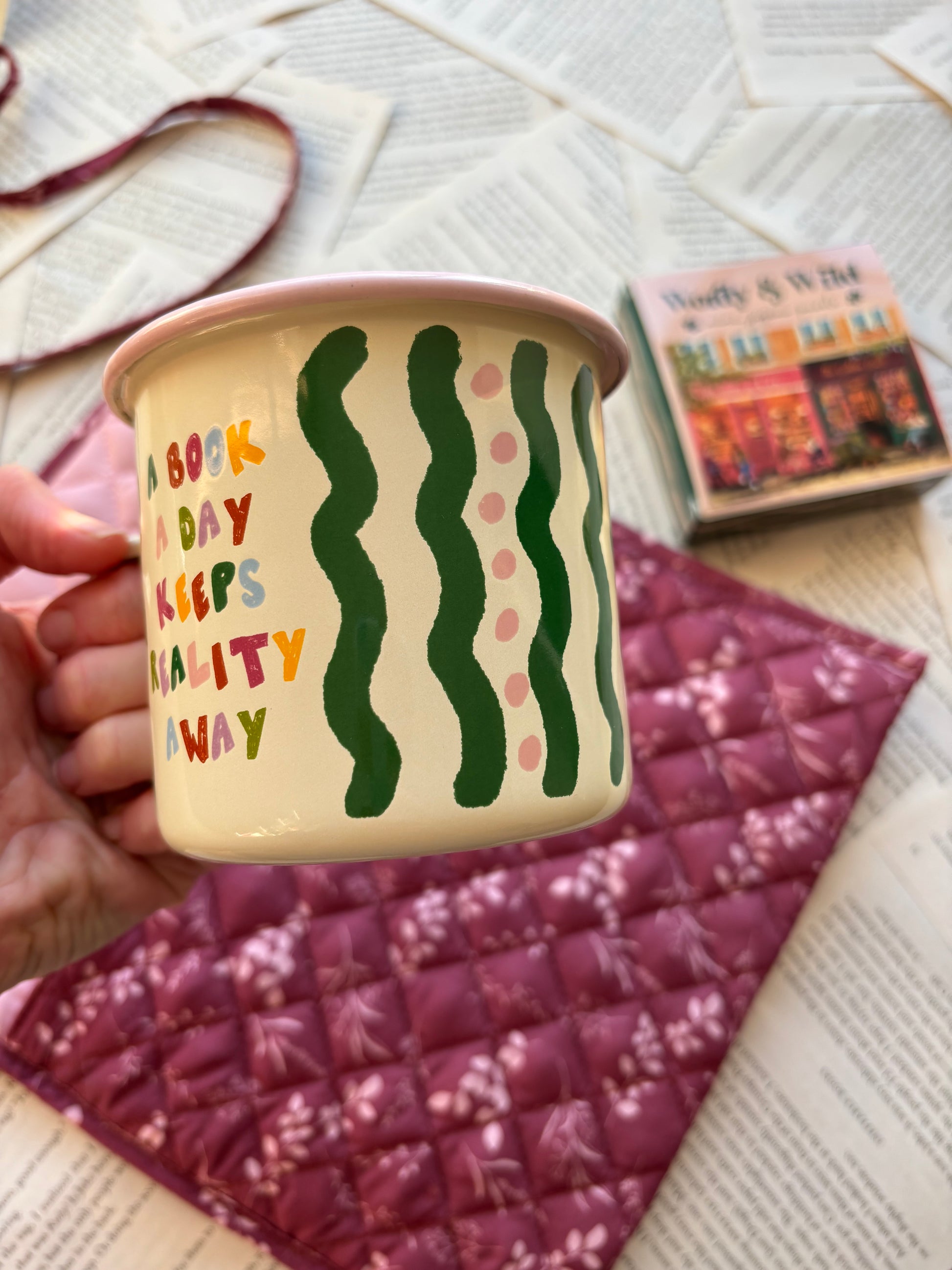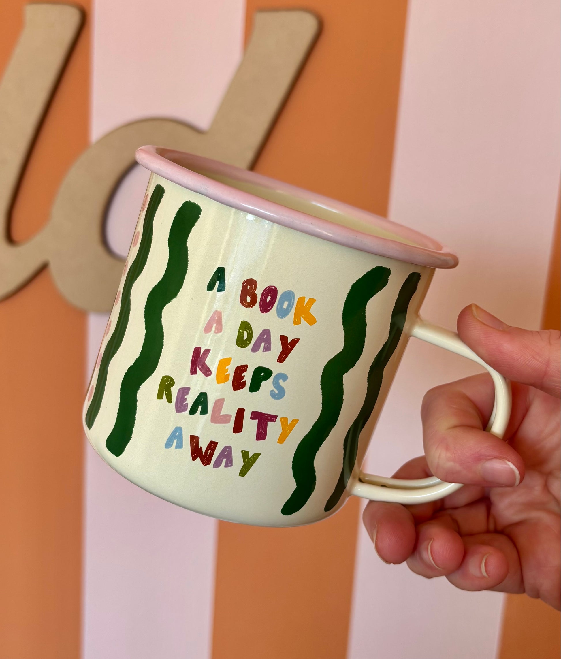 -Bookish quote ‘A book a day keeps reality away’ and ‘go buy that book’ at the bottom!